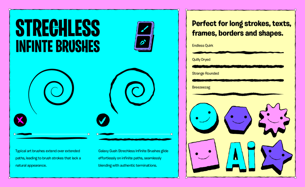 ✔️ Stretchless Infinite Brushes – 100 Pattern Brushes for Adobe Illustrator. Completely new and innovative brushes that glide effortlessly on infinite paths, seamlessly blending with authentic terminations.