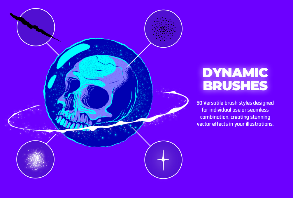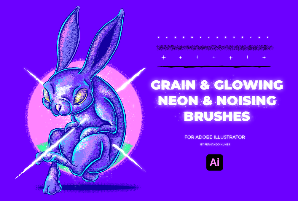 Draw crispy and brightly in Adobe Illustrator with The Intergalactic Grain & Glowing / Neon & Noising Inking Brushes. Ideal for texturing, shading, glittering, shinnying, sparkling and finishing effects.
