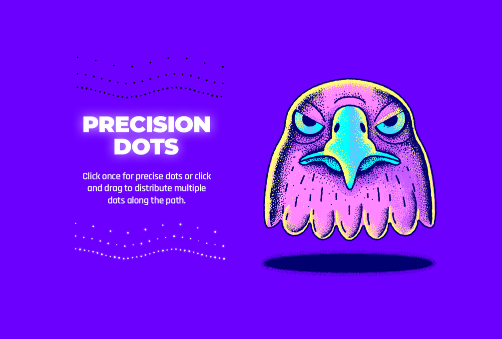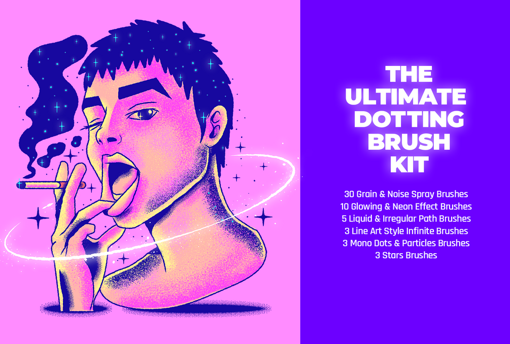 Draw crispy and brightly in Adobe Illustrator with The Intergalactic Grain & Glowing / Neon & Noising Inking Brushes. Ideal for texturing, shading, glittering, shinnying, sparkling and finishing effects.